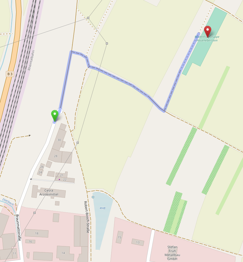 Am besten die "Braunmattstraße 76532 Baden-Baden" in das Navi eingeben und der Straße bis zum Ende folgen (grüne Markierung). Die Straße geht in einen etwas schmaleren geteerten Weg über. Diesem Weg ca. 130 Meter folgen und nach rechts in einen Feldweg einbiegen. Nach ca. 300 Metern geht der Feldweg leicht bergauf und wird wieder zu einem geteerten Weg - hier links abbiegen.